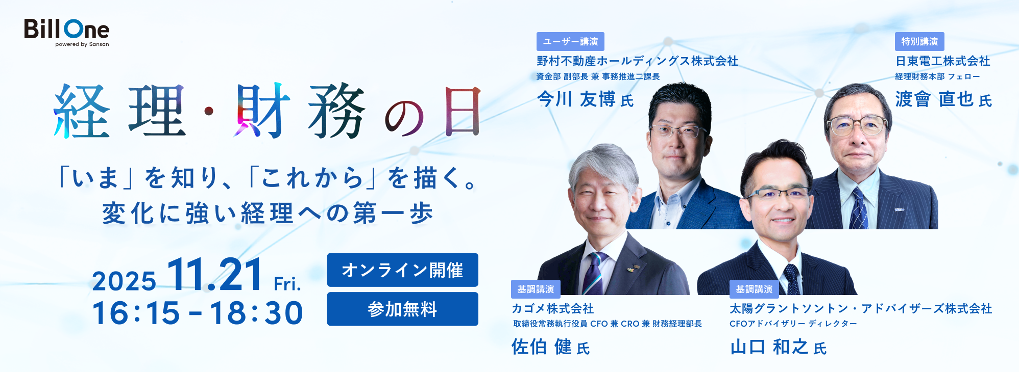 内容 | ▼タイムテーブル▼ 16:15~16:50 基調講演 変革期の経理におけるキャリア選択と組織構築 カゴメCFOと元社員が語る、あの時の決断とこれから 佐伯 健 氏(カゴメ株式会社 取締役常務執行役員 CFO 兼 CRO 兼 財務経理部長) 山口 和之 氏(太陽グラントソントン・アドバイザーズ株式会社 CFOアドバイザリー ディレクター) 企業経営において重要な役割を担う経理・財務機能は、これまで幾度も環境の変化に直面してきました。そうした変化に向き合う中で、経理人材はどのようにキャリアを描くべきか、またマネジメント層は、個々のキャリアを尊重しながら、組織としていかに持続可能な機能を維持していくかが問われています。本セッションでは、カゴメ株式会社のCFOと、かつて同社で経理業務に携わっていた元社員が登壇します。経理組織の在り方やキャリアの選択をめぐり、それぞれの視点を交えながら、いま求められる最適な経理機能の姿をひもときます。 17:05~17:40 ユーザー講演 経理DXによる業務変革とコア業務へのシフト 全社員の時間を創出する視点と実践 今川 友博 氏(野村不動産ホールディングス株式会社 資金部 副部長 兼 事務推進二課長) 国内外で多岐にわたる不動産開発・運営を展開する野村不動産グループ。その中核を担う野村不動産ホールディングス株式会社では、請求書業務の完全電子化を実現。経理業務全体から紙を取り払うことで業務効率を大幅に向上させ、組織の生産性向上につなげています。経理部門のみならず全社の業務の負担を最小化し、各社員が自身のコア業務に向き合う時間をいかに生み出すか。本セッションでは、Bill Oneによる業務改革の成果を最大化する工夫や社内展開をスムーズにする秘けつ、効率化の先に見据える今後の展望についてお話しします。 17:55~18:30 特別講演 数字は集計するものではなく想いを込めて変えていくもの 成果を生み出す税務マネジメントの経営への貢献 渡會 直也 氏(日東電工株式会社 経理財務本部 フェロー) Nittoでの30年以上にわたる税務マネジメントの構築の経験から学んだ、税務が生み出す経営への貢献が今回のテーマです。税務にとって重要なのは税法の知識や理解ではなく、経営層を含む社内のさまざまな関係者とのコミュニケーションを活発に行い、実際に望ましいアクションをとって、具体的な成果を生み出すことです。そこから生まれる「驚きと感動」が、税務の最適化に不可欠な社内の「組織知」を生み出し、さらに次の成果につながる好循環を生みます。私のキャリアで得た知見や考え方を基に、皆さんの業務に役立つ内容をお話ししたいと思います。 |