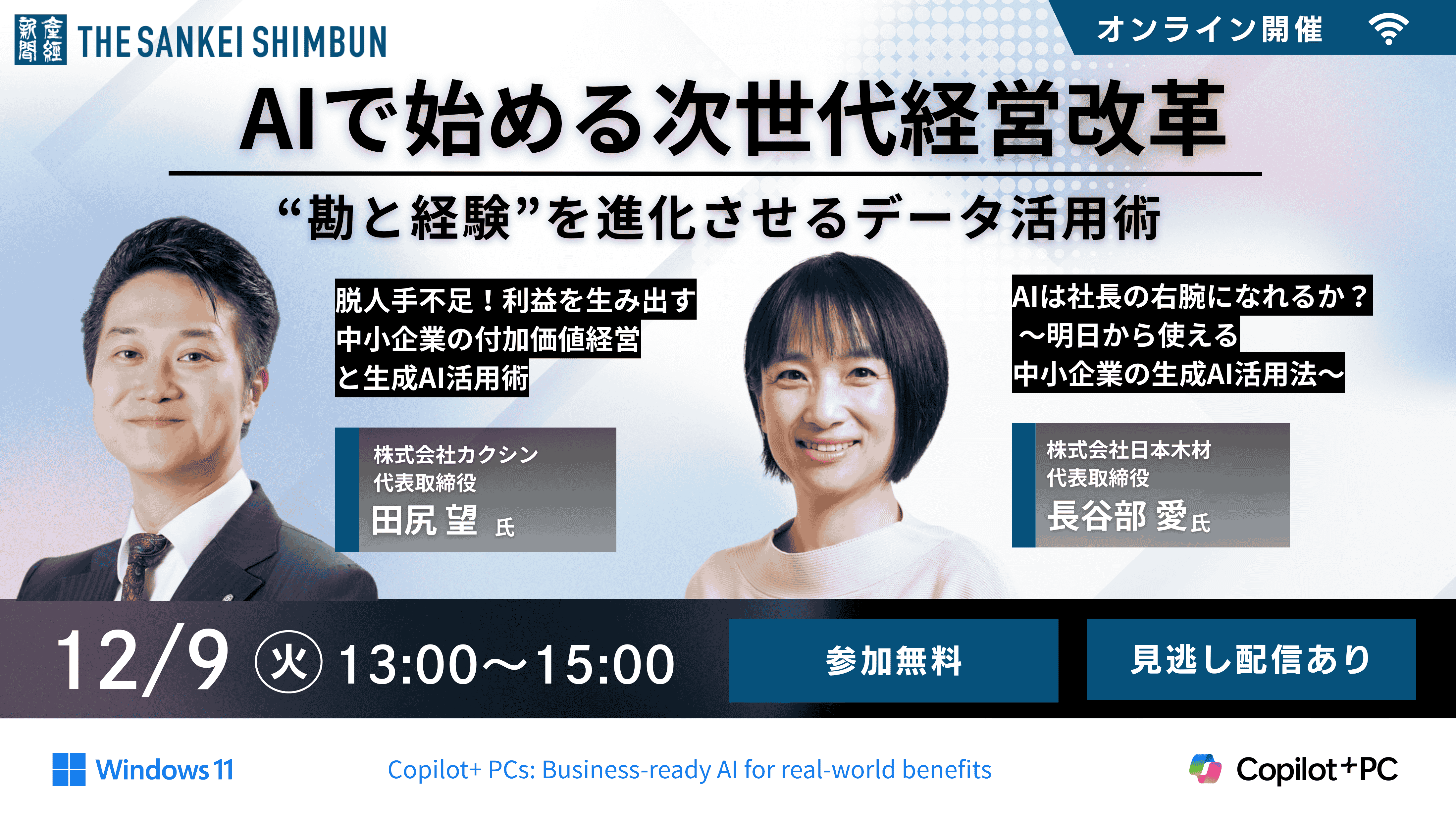 内容 | ▼タイムテーブル▼ 13:00~基調講演 脱人手不足!利益を生み出す中小企業の付加価値経営と生成AI活用術 田尻 望(株式会社カクシン 代表取締役CEO) 人手不足に悩む中小企業が、価格競争から脱却し高収益を実現するには「付加価値経営」への転換が鍵です。本講演では、キーエンス出身者が開発した「価値主義経営®」のメソッドと生成AIを戦略的に活用し、顧客の潜在ニーズを捉えた価値提案を創出する具体的手法を解説。限られた人材で利益を最大化する実践ノウハウをお届けします。 13:40~特別講演 AIは社長の右腕になれるか? 〜明日から使える中小企業の生成AI活用法〜 長谷部 愛 (株式会社日本木材 代表取締役) 「AIはうちには関係ない」「難しそう」と、導入を諦めていませんか?生成AIは、使い方次第で業務の効率化や、現場の課題・不安の“見える化”を支援し、経営判断を助ける心強いパートナーになります。本講演では、実際の事例を交えながら、人手不足や業務改善に役立つ“すぐに始められる一歩”をご紹介します。 14:20~企業講演 AIの力を現場に── Copilot+ PC から始めるスモールスタート 仲西 和彦(日本マイクロソフト株式会社 デバイスパートナーセールス事業本部 マーケティング本部 Commercial Windows戦略部 部長) 貞末 文子(Dynabook株式会社 国内マーケティング本部 兼 マイクロソフトソリューション推進部 副本部長 兼 部長) 為替や国際情勢の不安が続く中、AI時代を迎え、「従業員を守りながら、会社をどう支えるか」と悩む経営者の方も多くいらっしゃいます。そんな今だからこそ、AI活用に最適な環境を提供する Copilot+ PC を“新しい戦力”として迎えてみませんか?まずはスモールスタートとして未来へ踏み出す新しいPC活用をご紹介します。 |