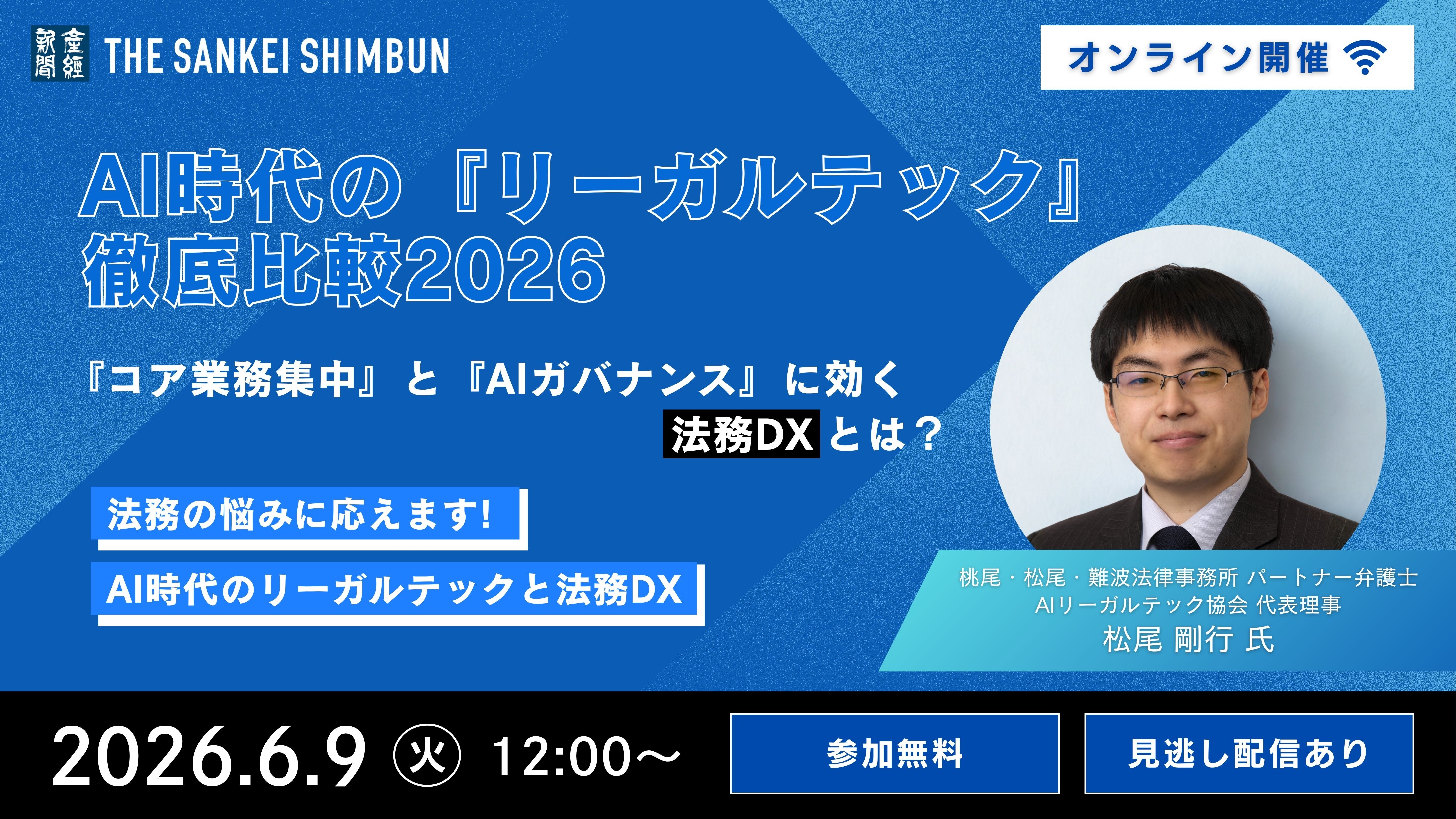 | 内容 | ▼タイムテーブル▼ 12:05~基調講演 法務の悩みに応えます! AI時代のリーガルテックと法務DX 松尾 剛行(桃尾・松尾・難波法律事務所 パートナー弁護士/AIリーガルテック協会 代表理事) 企業の中には既にAIやリーガルテックを導入しているところも多いでしょう。しかし「本当にその効果を実感していますか?」特に法務部門において、なかなか効果が実感できないという場合、この講演では、まずは総論としてリーガルテック導入企業等現在の法務DXにおける典型的な悩みと解決策を述べた上で、各論として個別の悩みな対する解決策をご説明します。 12:35~企業講演① 準備中 (株式会社BoostDraft) 準備中 12:50~企業講演② グローバル基準×日本への最適化:信頼のデータとAIが創る次世代リーガルエコシステム 森下 馨(トムソン・ロイター株式会社 プロダクト・マーケティング本部 統括部長) AI時代のリーガルテック活用において、真の差別化要因となるのは「データ・コンテンツの信頼性」と「カバレッジ」です。トムソン・ロイターは、圧倒的なグローバル展開に加え、日本専任のプロダクトチームによる国内法務への最適化を両立しています。本講演では、世界と日本の確かな法務コンテンツを基盤とし、専門家が実務で信頼できる「AI搭載型リーガルエコシステム」の全貌と、その優位性をご紹介します。 13:05~企業講演③ 生成AI・リーガルテックを使いこなす組織の条件——法務DXを実現する体制設計・整理の実践論 西尾 公伸 (Authense法律事務所 第二東京弁護士会所属 企業法務分野マネージャー) 生成AIやリーガルテックの進化により、法務DXはいよいよ加速しています。しかし導入ツールに関わらず、業務負荷が減らないという声も多い状況。この原因は、機能分担と体制の設計の整理が追いついていないことにあります。本講演では、法務DXを実現するための体制設計の考え方を、実務の視点からお伝えします。 13:20~企業講演④ 準備中 板谷 隆平 (MNTSQ株式会社 代表取締役/長島・大野・常松法律事務所 弁護士) 準備中 13:35~企業講演⑤ 生成AI×法務プロが変える企業法務の未来——CloudLegalが実現するリーガルテックの新標準 﨑地 康文(Molton株式会社 代表取締役CEO) AI契約レビュー・ドラフト生成・法務AIチャットの3機能を備えたCloudLegal AIプラットフォームと、弁護士・コンサルタント・エンジニアの専門チームを融合。法律事務所の品質とAIのスピードを両立し、日常の契約業務からM&Aデューデリジェンスまで、企業法務のすべてをワンストップで支援する新時代のALSPモデルをご紹介します。 13:50~企業講演⑥ JILAインハウスアワード受賞者が語る、自律化時代の「法務DX 2.0」と創造的マインドセット 美馬 耕平(弁護士) JILAインハウスアワード・イノベーション賞受賞者が、実体験を基に「法務DX 2.0」を提唱。DX推進の壁を突破した原動力は、法務のPurpose追求にありました。AIが業務に組み込まれる今、単なるツール導入を超え「真のコア業務」とは何かを再定義。変革を恐れない創造的マインドセットの核心に迫ります。 |